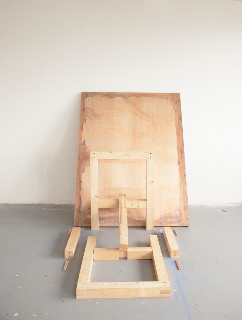 Établi Établi . Pin du Nord, contreplaqué et dessins au cordeau de menuisier . Présentation variable . 2016 .